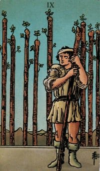 Trabajo: El nueve de bastos te dice que tienes la necesidad de defenderte a ti mismo y estas llamado a defender tus derechos tu reputación o una decisión que has tomado, aunque la decisión parece difícil estas parado en tierra firme, una vez que superes este último desafío estarás en el camino de éxito, si estas sin trabajo deberás competir con otras personas por el puesto mantén la determinación y lo lograras.